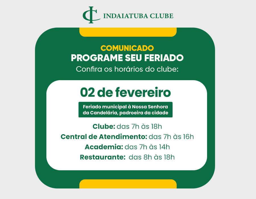 Confira os horários especiais de funcionamento do clube no dia 02 de fevereiro.