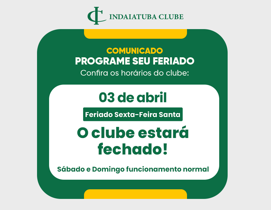No dia 03 de abril, feriado de Sexta-feira Santa, o clube estará fechado. Retornamos com funcionamento normal no sábado e domingo. Aproveite para se organizar e curtir seu feriado com tranquilidade.